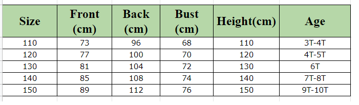 120=4T-5T Length: 77 Bust: 70 Waist: 66 Age: 4-5 years