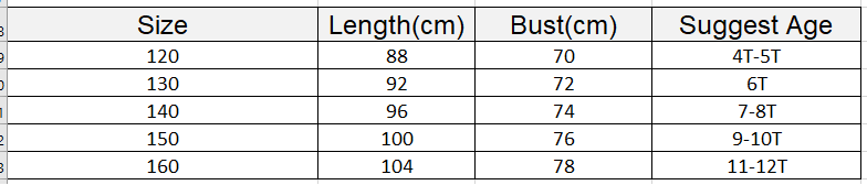 160 Length:104 Â Bust:78 Â Age:11-12T