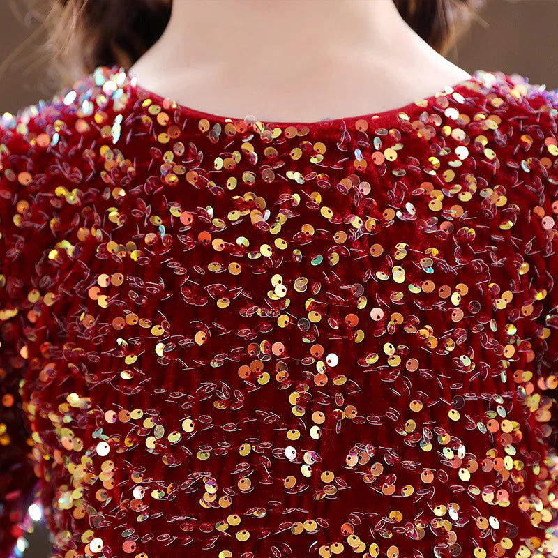 Girls Princess Dress Evening Party Festival Christmas Long Sleeve Skirt Sequins Mesh Dress Formal Party Dress Velvet Red