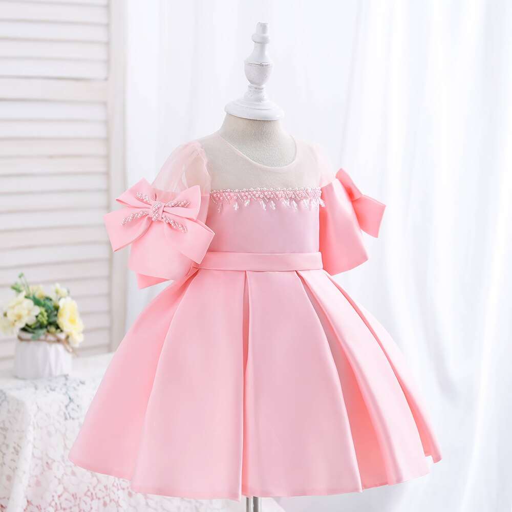 Satin Princess Dress Girl Bowknot Short Sleeves Pearl Tassel Dress, Elegant Kids Dresses
